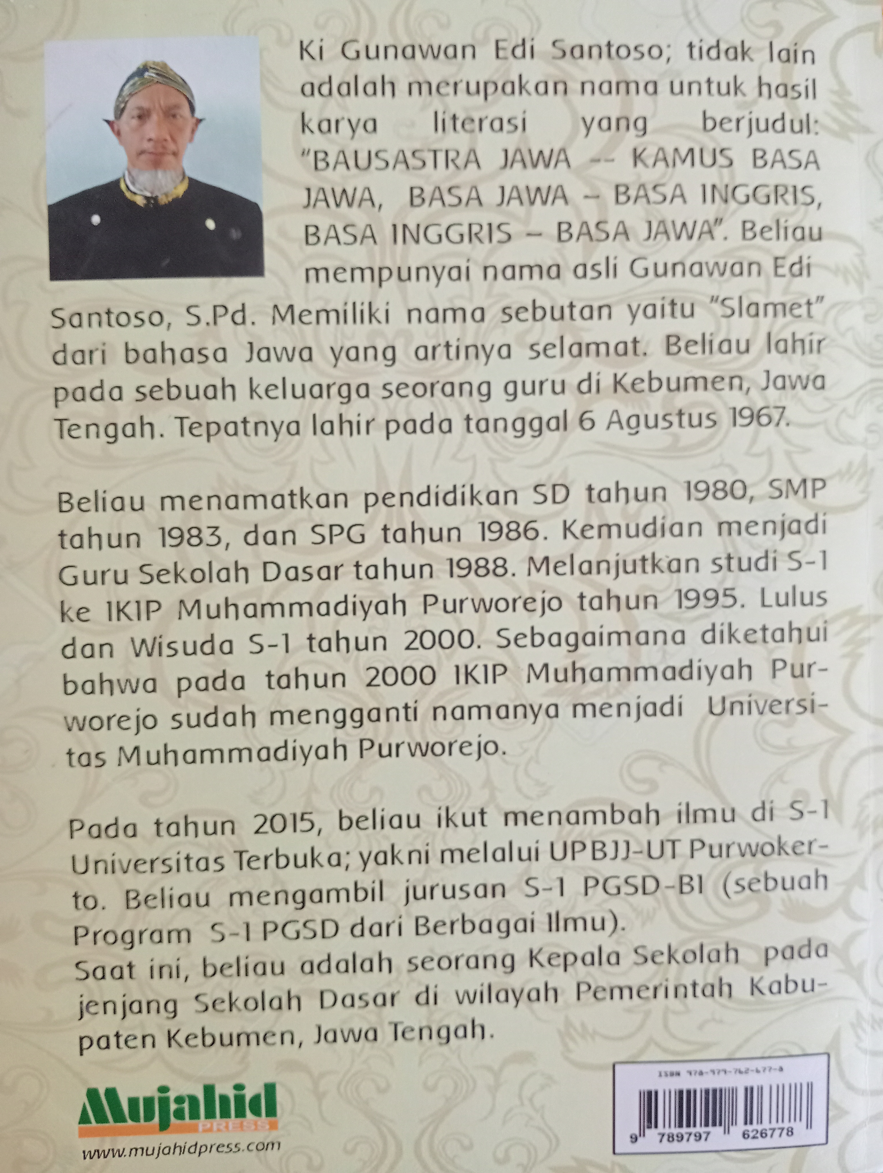 kasar ing perkebunan. Kanthi ananing olah pemikiran manawa penutur Basa Jawa kang cacahe gedhe lan sumebar tumeka mancanegara banget perlune ana sawijining karya sastra sing bisa kanggo nggedhekake lan nglestarekake Basa Jawa kuwi mau, yaiku; kamus utawa bausatra. Salah sijine yaiku “Bausastra Jawa, Kamus Basa Jawa, Basa Jawa – Basa Inggris, Basa Inggris – Basa Jawa,” kaya buku iki.