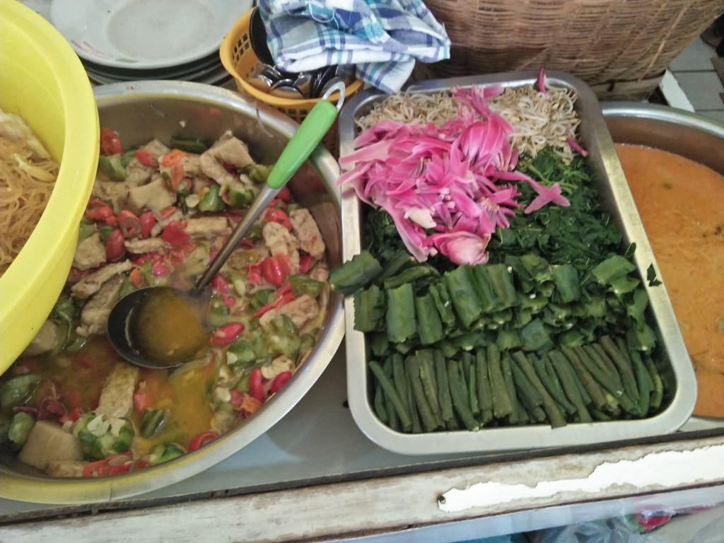 - collect some vegetables viz. spinach, cabbage, long bean, sprout, yonger cassava leaf (as much as needed), sliced-peeled green papaya, flower of kecombrang, parsley, kangkung, cauliflower, and soon.